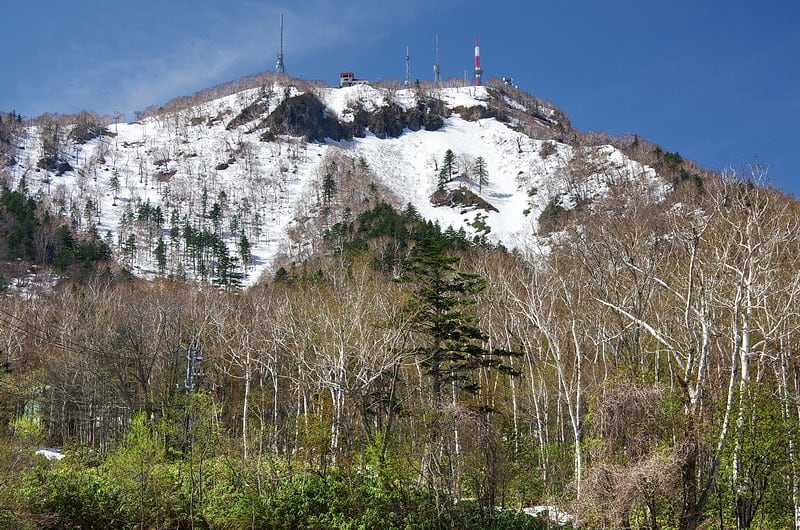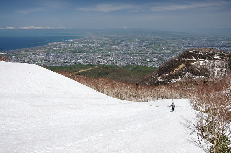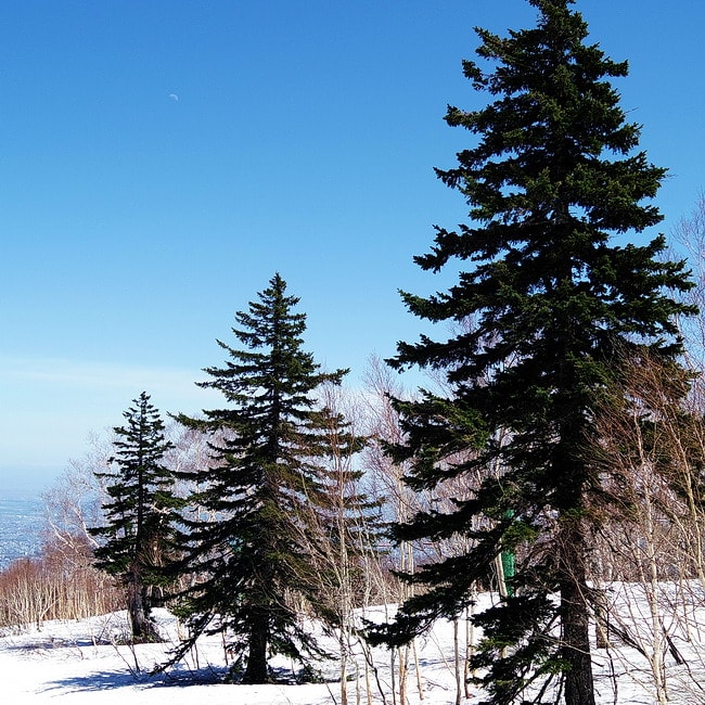 2016-05-13 5月13日 今日の手稲山 野歩き山歩き 今日はギンギンの快晴なので手稲山へ行ってきた、中腹のダケカンバにまだ緑はない。 ゲレンデにはまだ雪がベッタリ、スキーでもボードでも尻滑りでも何でもできる。 今年は山の雪が多い、頂上にはまだ雪が残っている、南の方の山々もまだ真っ白だ。 三本のアカエゾマツに下弦の月(左上に小さく写っています)。 また始めました「山でオニギラズ」昼飯食いに山へ行っているようなものです。
