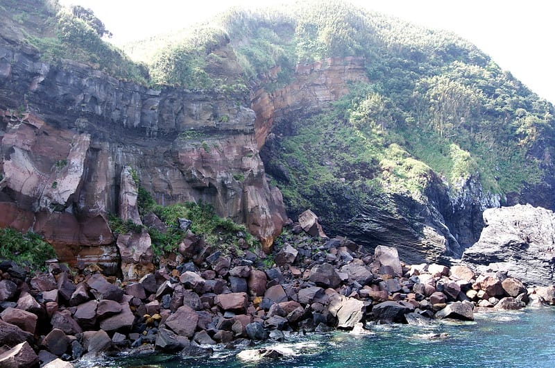 硫黄島の西の端に有る大浦港の崖、層状に重なっている赤茶けた地層が7300年前の