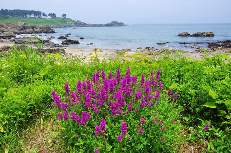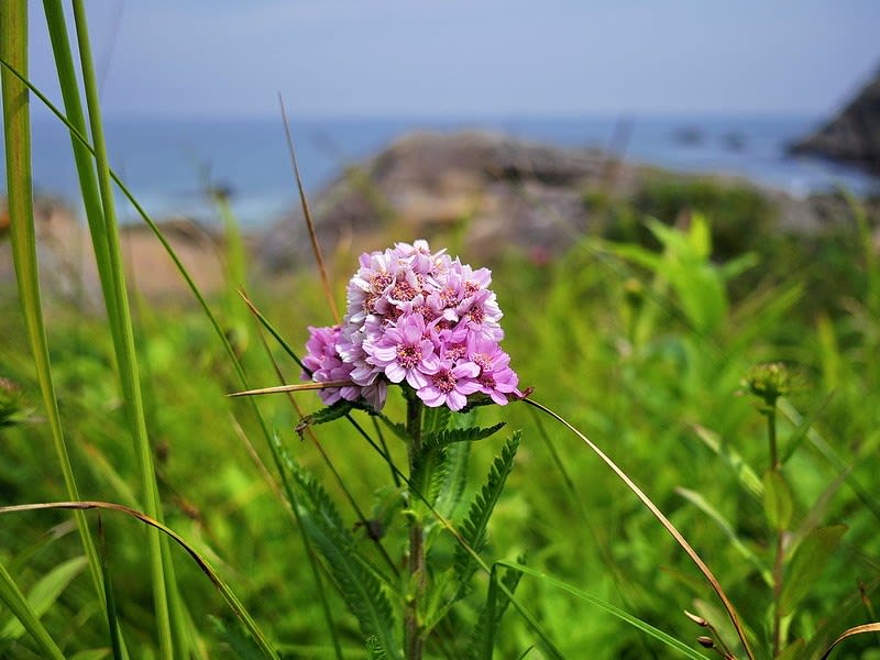 2017-07-15 中須賀海岸 野の花いろいろ 野の花山の花 葦毛崎展望台を過ぎると中須賀海岸、こんな狭い所にいろいろと野の花が、主だった物をいくつか。 ハマウツボ、初めて実物を見た。 エゾミソハギ、青森県なので北海道と植生は同じだ。 オグルマ ノコギリソウ ノビル タチギボウシ ツリガネニンジンとキリンソウ ミヤマビャクシン(シンパク)が岩に張り付いている。 スカシユリと落ちそうで落ちない岩。 花いろいろ、キリンソウ・スカシユリ・ノハナショウブ 野の花いろいろを魚眼レンズで。