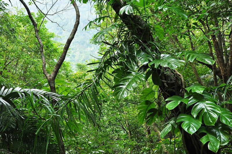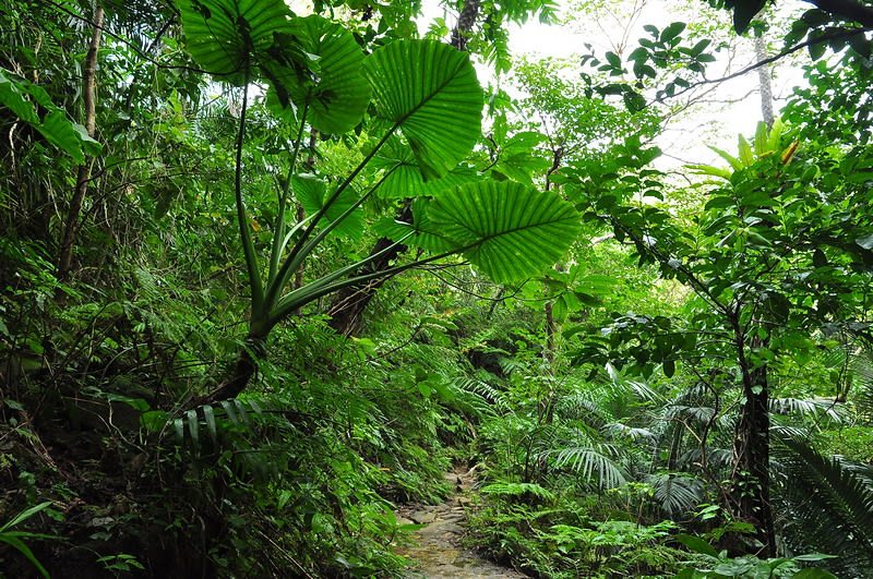 巨大なクワズイモの葉が山道を覆う。