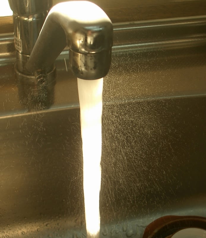2007-01-03 キャビテーション・・・? 写真 この時期朝日はほぼ水平に室内を照らします。朝食の支度をしようとして蛇口を捻ったら、こんな現象が目 に飛び込んできました。細かい飛沫が蛇口の周りに飛び交っていたのです。蛇口の構造上の問題か、水流に泡 が多いことは前から気が付いていたのですが、もしかしたらキャビテーション?